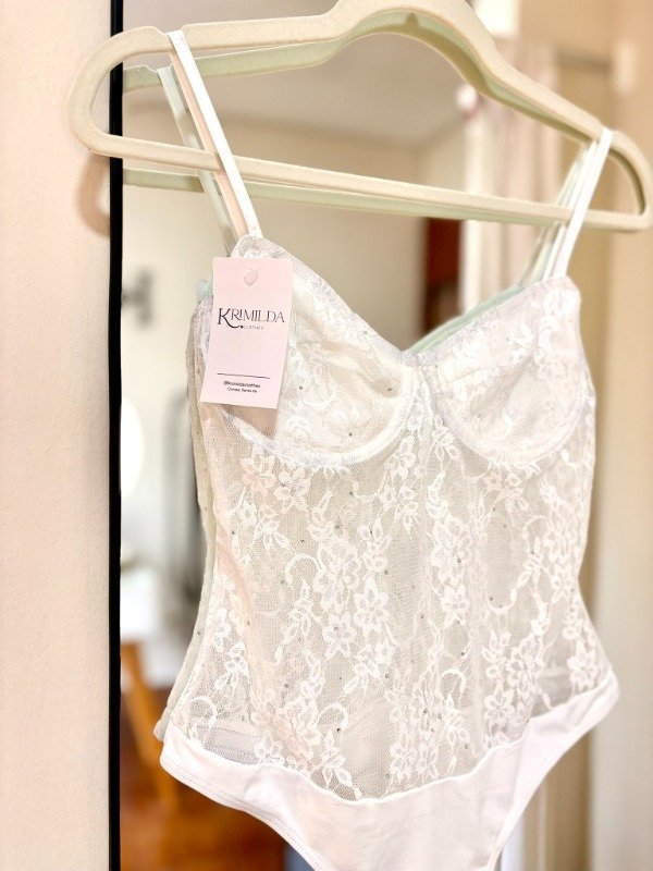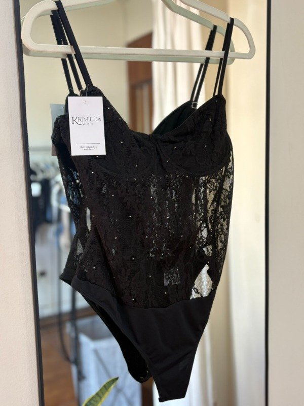 Body de encaje y brillos. Posee tazas con arco y forradas.